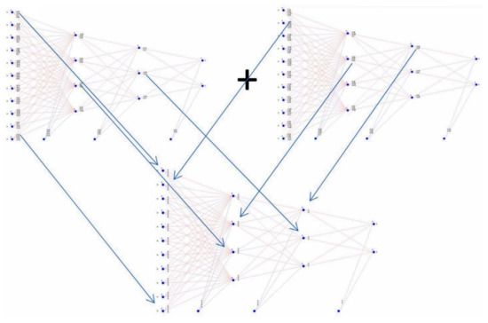 The first step towards new generation creation, i.e., the generation of a first population member within the first generation is the crossover process. Neural network from the previous generation with the first and second-best neural networks are mixed (Figure 11). More precisely said, weight coefficients are mixed in the ratio of “how much the first neural network is better than the second” in such a way that the weight coefficients from both networks are copied to the new empty neural network. A completion of the crossover process (mixing) generated a new neural network.