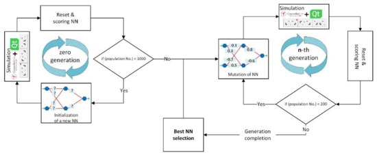 A newly created neural network is forwarded to the mutation process (Figure 12). Randomly selected weight coefficients are overwritten with the new, randomly selected coefficients. The number of weight coefficients that are overwritten depends on the percentage of mutation. Crossover and mutation processes belong to genetic algorithms which can be thought of like Darwin’s theory of evolution simulation. The mutated neural network is “embedded” in the simulation is described in Section 4.1. The following steps are described in Section 4.1, Section 4.2 and Section 4.3, where the step described in Section 4.3. (Generating a new neural network), is replaced with the neural network generated by crossover and mutation product, described in Section 4.4. (Completion of zero generation), where the end of each subsequent generation is now defined. A new neural network is generated for each population member in this way (Figure 13). The best and second-best neural network are selected in the next generation as a continuously repeated cycle. Iterations of neural network generations indicate that eMIR is getting “smarter” and “solves the scenes (polygon)” in a more effective and faster way (Figure 14). Such cognitive learning of polygon solving process is stopped arbitrarily after adequate level of wanted eMIR’s behavior. An adequate level of behavior is usually stated when learning stagnation is occurred (scores do not change or change is negligible).