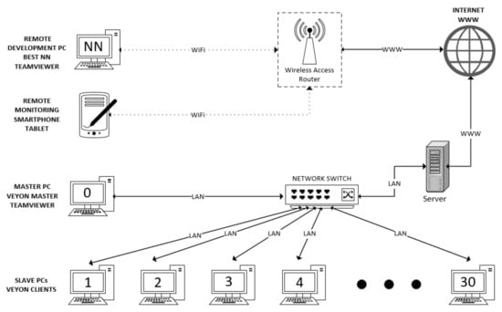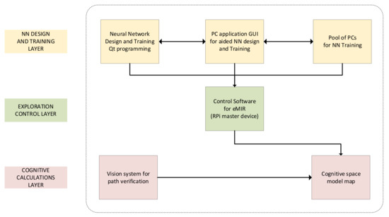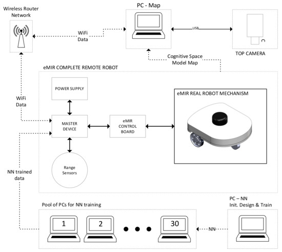 The entire learning and training process of eMIR’s behavior was initially executed on a single computer labelled PC-Neural Network (NN). Due to the learning process complexity, a very long execution time was needed. It was necessary to speed up the process several times, which was an impossible task due to all speed-up measures that had already been taken in the previous step. Therefore, a simultaneous learning and training process on the pool of computers is developed. The pool of computers consists of thirty personal computers usually available to the average user in terms of computational power. A first step in the learning and training process using the pool of computers was the initialization of neural networks on all computers. Thirty neural networks were created, and the best one with the best learning score was stated. Each subsequent learning and training iteration is initiated from starting “learning and training” point that is the previous best learned, trained and mutated neural network. Observing the learning score concludes which network is best learned and trained. Data values in the form of a textual file with numerical values are generated from the network with the best learning score. The neural network code is adapted to a mobile robot’s target master device computer (RaspberryPi; Linux; C programing language) installed on the mobile robot’s system.