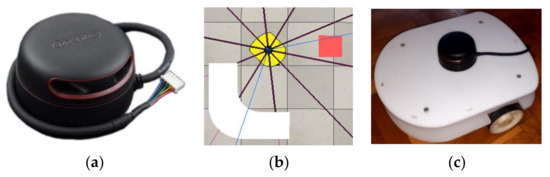 - Robot’s laser range sensor (LiDAR)—in a simulation environment for the learning and testing data collection, LiDAR uses one detection laser beam on every 36° of a circular, horizontal pattern. This pattern and range are defined in CoppeliaSim virtual reality software. Full range sums a total of ten beams, as shown in Figure 6a. In the actual real-world system, developed for the research experiments, LiDAR operates on the same principles as in the simulation, as shown in Figure 6b.