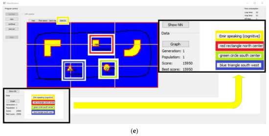- Robot’s camera—captures the environment in front of the mobile robot. It has a 55° field of view, and object colour recognition can be done of the captured image. A separate software module processes the image and passes the recognition information to another module through a virtual communication channel. With the development of control algorithms accomplished in this research, this camera’s role in the system is minimized, so the camera is eventually excluded from the mobile robot’s control loop. Developed neural networks, supported by the developed genetic algorithms, solve a controlling process of mobile robot motion path successfully in learning, testing, and exploring a previously unknown environment. Of course, if it is an application of a mobile robot in the industry, the camera should be included in the control loop, for additional safety standards. It is necessary to have sensors on several levels and various detection systems. In case of failure of one level of operation, others remain functional.