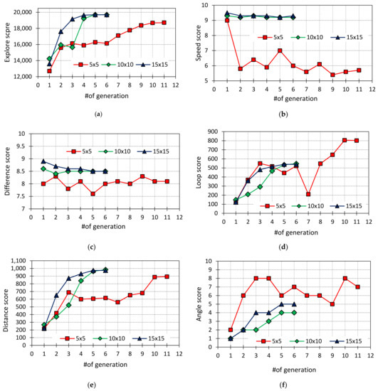 Neural network learning results through the neural network generations: (a) exploration score; (b) speed score (velocity coefficient); (c) difference score (velocity difference); (d) loop score (number of iterations); (e) distance score (distance reached); (f) angle score (angle between eMIR and free environment).
