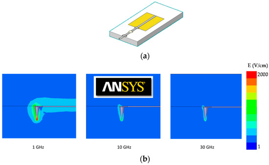 In contrast to microwave-guided measurements, including a metallic waveguide, coaxial, on-wafer propagating structures for which the traceability has been established for decades, the normalization of SMM technology, including the experimental set-up and the measurement configuration and calibration standards, are still an issue. Whereas SMM technology has been identified as a unique solution to provide a microwave and millimeter-wave characterization at the submicron scale, there is an urgent need to harmonize the best practices at the international level. In particular, we identified the main bottlenecks to be tackled for offering quantitative and traceable SMM measurements. Firstly, whereas AFM can operate in air to provide a topography image of the sample under test, water meniscus in the vicinity of the apex tip of the probe contributes to the overall complex impedance at the apex tip, especially because water has a high dielectric constant and loss tangent in the microwave range. Moreover, the shape of the water meniscus is usually unknown; therefore, only approximations of the water meniscus can usually be derived by 3D electromagnetic modeling and are not easily discriminated from other parasitic capacitances involved in the measurement. Operating in a vacuum presents the advantage to allow the elimination of the water meniscus by heating the sample, simplifying the electrical modeling. Secondly, a second advantage of operating in an SEM is the possibility to directly image the probe in contact with the sample, even during the scanning operation. Indeed, probe microscopy tools, especially in the contact mode, are methods that may damage the sample or the tip apex with impacts on the electrical measurement, especially in the case of RF electrical measurements using sub-100 nm platinum/iridium wire as a sensing element. Finally, it is well accepted in the SMM community that spatial resolution is mainly governed by the apex tip geometry [36]. In particular, to surpass the diffraction limit imposed by the half-wavelength of radiation, waveguide structures with dimensions far below the wavelength of excitation exhibit evanescent electrical fields in the vicinity of the apex tip. Nevertheless, the collimation of the electrical fields is frequency dependent. Therefore, operating at a higher frequency improves the distribution of the electrical fields and the lateral resolution and, incidentally, the signal-to-noise ratio (SNR). To verify this assumption, electromagnetic simulations using a high-frequency structure simulator (HFSS) were performed at three test frequencies (1, 10 and 30 GHz) by designing an RMN probe and plotting the distribution of the electrical fields (the magnetic field here being negligible), as shown in Figure 2.