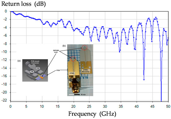 As expected, the lateral resolution, i.e., the footprint of the electrical field distribution at the probe apex, decreases for higher frequencies. It has to be mentioned that the depth resolution is of course lower. These results are in favor of operating in the millimeter-wave regime. Nevertheless, as the transmission losses increase with frequency, especially in the RF cables and transitions from the input of the VNA to the AFM/SMM tip, there is a compromise between the lateral resolution and SNR. As an illustration, we present in Figure 3 the measured return loss measured up to 50 GHz of the probe. For frequencies greater than 35 GHz, the standing wave ratio is more pronounced, leading to a mixing of the amplitude and phase-shift of the complex reflection coefficient at the probe apex. It has to be mentioned that the measured response can be enhanced by considering the optimization of the mounting and soldering of the AFM/SMM probe on the PCB substrate, both done manually. In the following, we consider measurements performed at the test frequency of 30 GHz.