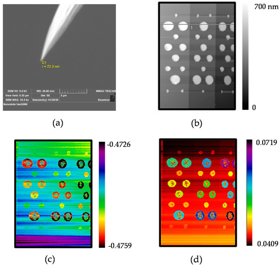 The standard operation procedure (SOP) described here follows the material preparation presented in the previous section. First, we ensure a stable lab climate in a controlled environment (temperature, humidity) to enable the stable operation of the SMM with minimum mechanical and electrical drift. The measurements are performed at 30 GHz using a modified 25PT300A AFM tip from Rocky Mountain Nanotechnology®. A PNA Keysight® E8364B VNA with the RF power source set to 2 dBm and the intermediate frequency bandwidth (IFBW) to 50 Hz is used. Highly stable coaxial cables and feedthrough coaxial transitions are used to connect the VNA to the probe. Nanonis® Signal Conditioning (SC5) and Real-Time Controller (RC5) modules are used to drive the AFM measurements. The cantilever deflection voltage is set to 90 mV, the approach–retract factor is about 6 nm/mV and the resulting force is estimated to be 9.7 µN. The images were scanned over 40 × 40 μm2 with 256 pixels with a scanning time (forward and backward) of 5119 s. Prior to the measurement, SEM imaging of the apex tip is performed to check the tip shape (Figure 5a). Topography, together with both real and imaginary parts of the measured complex reflection coefficient ΓM images, is acquired simultaneously (Figure 5b,c).