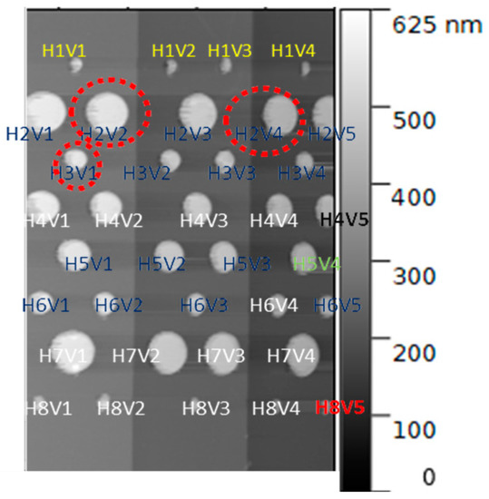 The raw data are transferred to Gwyddion® software for analysis. We cross-check the images from Figure 5 together. Then, each capacitor on the atomic force microscopy image in Figure 5b is referenced according to Figure 6.