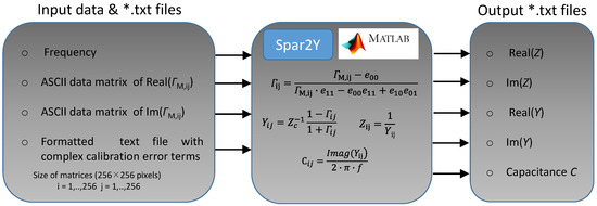 Functional diagram of the MATLAB® script developed for quantitative data determination. The input data file *.txt consists of the frequency of operation, measured real and imaginary parts of the complex reflection coefficient ΓM,ij and complex calibration error terms. The code Spar2Y determines the calibrated complex reflection coefficient Γij at the probe tip and the related complex impedance Zij admittance Yij (including capacitance Cij). An output *.txt file is generated.