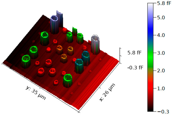 - Electrical drift of the microwave instrumentation is inevitable. Although its impact is reduced for capacitances greater than 300 aF, there is an urgent need to introduce solutions to achieve stable measurements for capacitance as low as 1 aF. To tackle this issue, the microwave path must be reduced to the minimum. The research direction should be directed towards the implementation of the microwave instrumentation closest to the probe. In particular, we omitted capacitances below 300 aF as the longitudinal drift (along the y-axis) is not compatible with accurate extraction of the electrical parameters. To complicate, the reference kit is used with the smallest capacitors on the top and on the back of the scanning area. It is highly recommended to design reference kits by taking into consideration the electrical drift. In other words, the scanning area and in particular the scanning time must be reduced as necessary to yield consistent quantitative data.