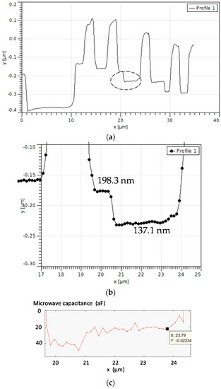 In the following section, we analyze the capacitance fluctuation considering a straight 1D profile as presented in Figure 11a (non calibrated topography). In particular, we focus on the smallest capacitors related to the probe tip directly in contact with the silicon oxide layer. Figure 11b shows a zoomed-in version of Figure 11a in the x-range of 17–25 µm. Two steps of silicon oxide with absolute thicknesses of 198.3 and 137.1 nm are identified. The related extracted microwave capacitance profile demonstrates that the corresponding capacitances are about 40 and 22 aF, respectively, with fluctuations of about ±5 aF.