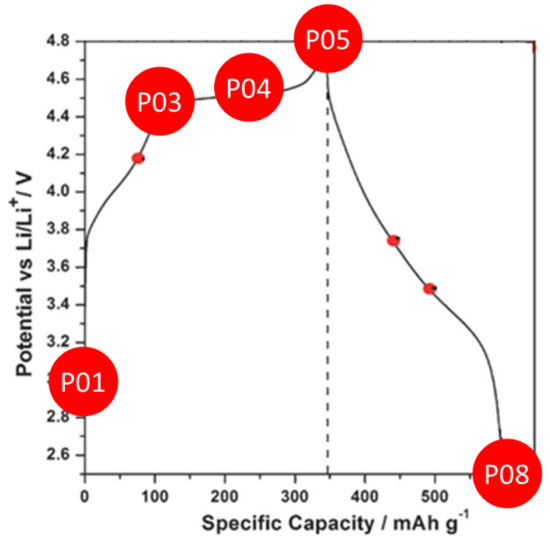 Li[Li0.2Ni0.16Mn0.56Co0.08]O2 was prepared by a coprecipitation method and coated by a VOx layer as described in detail previously [19,20]. Electrodes were prepared by casting slurries of composition 85% active material, 10% conductive carbon black (C-Nergy, Super C 45, Imerys), and 5% binder (CMC; DOW Wolff Celulosics, Walocel CRT2000 PA12), onto 25 µm Al foil and assembled in electrochemical cells as detailed earlier. Several cells were driven to different states of charge along the galvanostatic cycle test at a charge/discharge rate of C/10 (Figure 1). The respective cells were dismantled inside an Ar filled glovebox, the cathodes were extracted and rinsed in dimethylcarbonate (Sigma-Aldrich, Germany). Samples were scratched off from the collector and deposited on carbon-coated Au TEM grids. Dimethylcarbonate was used to wet the sample powder and improve its adhesion on the TEM grid. The grids were then stored under Ar in cryogenic vials and transferred to the microscope in cryogenic condition (T < 110 K) under N2 vapor to avoid atmospheric contamination.