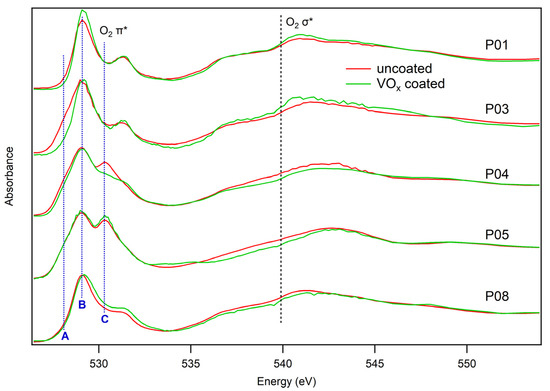 Normalized O-K spectra obtained from the average intensity of valid pixels in the field of view. Coated and noncoated samples of the same point of charge have been grouped to favor comparison. Vertical blue bars mark the position of the three components A, B, C considered in our analysis, while the “O2” labels denote the position of the main features of molecular oxygen according to Ruckman et al. [21]. Note that the O2 π* feature overlaps with component C.