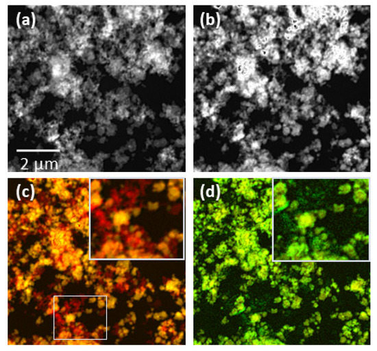 Images obtained from the pristine Vanadium-coated sample. (a) absorbance map averaged in the O-K pre-edge energy range (526.3–527.2 eV); (b) absorbance map averaged in the O-K prepeak energy range (C peak region, 530.3–530.1 eV); (c) composite image with following channels: red (a), and yellow (difference b-a); (d) composite image from the V-L region (516.8–525.9 eV), green channel, and (b), yellow channel. The background from the pre-edge has been subtracted from both oxide and vanadium components. Insets in (c,d) show a detail at increased magnification.