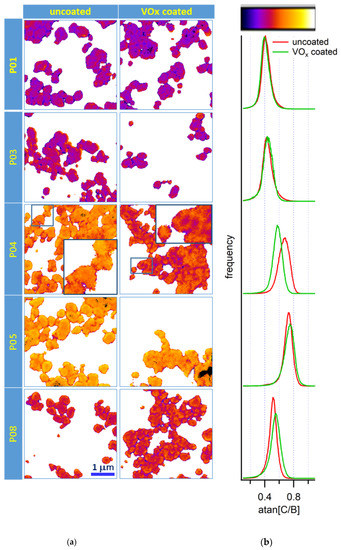 A statistically more proper representation of component ratio is using the arctangent of the ratio, as explained in Appendix B. When plotting distributions of ratio values, skewed shapes are obtained in general, while the arctangent allows avoiding intrinsically asymmetric representations of distributions and better discrimination of compositional heterogeneities that are reflected in deviations from the normal Gaussian shape. Figure 4 shows the detail of C vs. B maps and corresponding histograms that allow analyzing the spectra heterogeneity on the sample. As B is the most intense and dominant component of the sample, we use it to normalize changes in C and remove thickness effects. The choice of a nearby component for normalization reduces the impact of small misalignments and possible sample contractions that may then produce artifacts. The spectral variations along the charge-discharge cycle are reflected by the shifts in the average value, which increases slightly from P01 to P03, corresponding to the sloping part of the profile, where the main process is the Ni oxidation, and more strongly with P04 and further at P05, where the anion redox is expected to contribute in overlap to the partial Mn reduction, and component C emerges. With discharge the component C withdraws partially, leading to the decreased ratio. The delay caused by the VOx coating indeed is also evident at P04, because C does not move before this stage. The peak width also increases considerably at P04, particularly with the uncoated sample. This looks not related to the value of the ratio, because the distribution becomes sharper again at P05. Not only can we infer an increased composition heterogeneity in this sample. At a closer look, the uncoated P04 distribution also becomes quite asymmetric, with increased intensity on the side of lower C/B ratios. This seems related to a larger relative number of regions with lower O2 content, in some regions of the bulk, and generally at particle edges, which could be seen as a possible confirmation of the escape of molecular oxygen from macroscopic cracks or damages in the particles. The smaller width for the corresponding coated sample corresponds to a more homogenous composition, which could be mainly attributed to the delayed delithiation of the active material. In fact, both distributions are quite similar at the fully deintercalated sample P05. Nevertheless, looking at P08 the coated sample seems to show slightly poorer reversibility and a more irregular distribution of areas with different colors. The uncoated sample instead shows a more ordered arrangement, from the edge to the bulk, of lower-higher-lower ratio, which seems to correspond to concentric layers with different thickness. As proposed by House et al. the surface layer could correspond to a densified, oxygen-poor region [14], while the bulk should have an evenly distributed concentration of trapped oxygen. However, we notice also a layer of high concentration of oxygen that may accumulate at the interior of the densified shell, confirming that the shell may act as a barrier for further oxygen release.