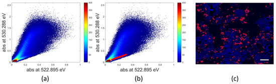 (a) Phase map where the absorbance peak value at ~530.3 eV versus the absorbance pre-edge values (~522.9 eV) is plotted. Two populations of pixels with different oxygen abundance with respect to the total material thickness are clearly distributed on two lines with different slopes. The selection of the pixels on the smaller slope line corresponding to lack of oxygen or abundance of carbon is shown in red in (b) and the corresponding distribution in the field of view is reported in pink in (c). The scale bar corresponds to 1 μm.