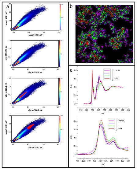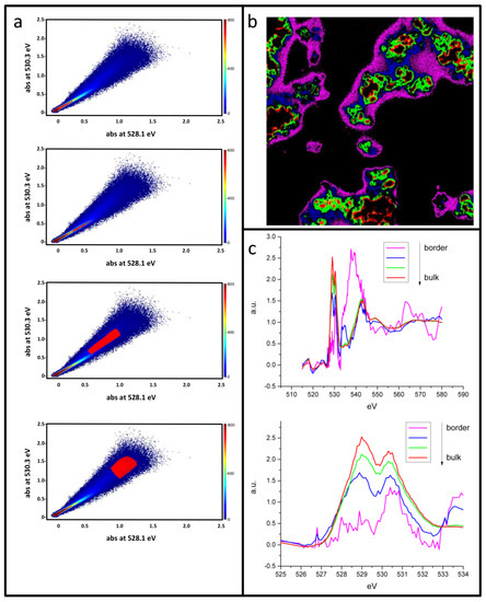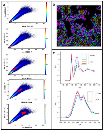 We propose an alternative representation as phase maps, based on the comparison of the pixel-by-pixel absorbance collected at two particular energy values. The distributions expressed as ratios can be resolved by plotting one component vs. the other, obtaining scatter plots, where different ratios or a different thickness can be systematically selected in the field of view. Pixels with different absorbance ratios of the two selected peaks will be easily identified. For instance, in Figure 6, the phase map for P05 is reported for peak C (~530.3 eV) versus the absorbance value in the pre-edge region (~523.0 eV). Because of the great number of pixels (≈106) the density of point is reported using different colors. The scatter plot has a characteristic plume shape, with the spot at the origin corresponds to background pixels outside any object. Larger sample thickness will correspond to points more distant from the origin. Two populations of pixels distributed along two lines with different slope are clearly visible (Figure 6a). Selecting the pixels corresponding to the small slope line (Figure 6b), i.e., small oxygen content, we are able to select regions in the sample where instead the carbon additive is abundant (Figure 6c).