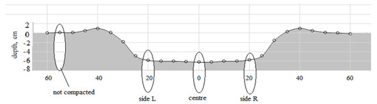 After harvest, usually in “reduced-till” system, the shallow tillage is used, but working parts of implement do not reach the bottom of tramlines, cannot loosen soil, properly mix residues into the soil in these tramlines. The sinks of soil surface were estimated 6 ± 0.5 cm, the cross section of compressed soil area 280 ± 15 cm2 (Figure 3). The tillage depth of opposite disc was selected 6 ÷ 8 cm, only for soil surface aligning. The measurements of soil density, water content and soil penetration resistance (Figure 4 and Figure 5) show that the psychical differences of compacted and not compacted soil were mostly in the ploughing soil layer from 0 to 25 cm.