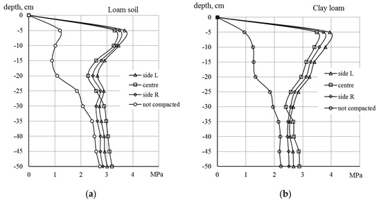 Soil penetration resistance on loam soil (a) and clay loam soil (b).