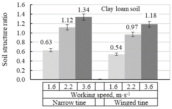 The soil aggregates ratio ks was insufficient with both tines types when working speed was minimal (1.6 m∙s−1). The amount of large course soil aggregates was about twice greater than during the tillage test at high working speed (3.6 m∙s−1). Results reveal that respectable value of soil structure aggregates ratio on clay loam was obtained by narrow tine shape, proceeding treatment at maximum speed, however, on loam soil—by winged tine, at average speed. According to results, it is stated, that the increasing of working speed has the effect on more qualitatively clay loam soil structure. It can be said that its need to increase working speed on clay loam soil, because the inertia force helps to granulate soil structure [35]. Therefore, in comparison results of soil structure ratio ks shows that it is necessary to use the different equipment’s adjustment on different soils types—what especially relevant for tillage in the same field with different soil types. During the next operation tillage by moldboard plough, it was observed that soil structure was better and smaller clumps were formed in the fields with restored tramlines.