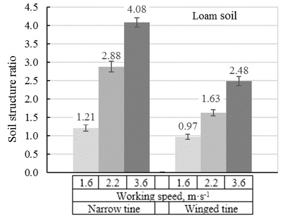 Pires et al. [34] proposed that soil structure represents one of the main soil physical attributes indicators of crop rooting zone. The porous system of renovated soil is directly linked to water retention, root development, gas diffusion and the conditions for all soil biota are related in forming soil structure [35]. The effects of the tillage operations on the soil system must be considered with improved soil structure and residue management, better rooting makes the crop more efficient into the soil profile. Results are showed that type of tines shapes and working speed influenced the soil aggregate fraction ratio (ks). The narrow shape moved soil in front of itself, rolled up and more intensive crashed compacted soil at increased speed mainly. The winged shape lifted soil, created disturbed area, and did not crush intensively compacted layer to fine soil aggregates fraction. A higher volume of coarse fraction was observed in clay loam to compare with loam soil. As expected, the area of disturbed soil was greater with winged shape type, this is considered as better option, similarly as [36]. The significant differences of soil structure aggregates fraction ratio are noticeable between treatments in variation tines shapes types and working speed regime. The aggregates fraction ratio ks increases from 0.63 to 1.34 with narrow shape when the working speed increased from 1.6 to 3.6 m∙s−1 on clay loam soil, and on loam soil—from 1.12 to 4.08 (Figure 8 and Figure 9). The loosening with winged tine shape, when the working speed increased from 1.6 to 3.6 m∙s−1 on clay loam soil, aggregates fraction ratio ks increased from 0.54 to 1.18, on loam soil—from 0.97 to 2.48.