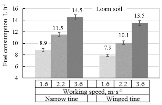 The hourly fuel consumption depends on the tractor draft force which required to pull an implement [25]. Draft force depends on adjustments of implementing and working speed as accessible tillage level, and it defined as tractor drawbar resistance [27]. Various tillage system scenarios for soil tramline’s renovation quality level were obtained by changing the tine shape type and working speed. It was found that adjustments that request to obtain the desirable level of soil renovation influenced the hourly fuel consumption from 7.9 to 17 L·h−1 (Figure 10 and Figure 11). The fuel consumption was higher on clay loam than on loam soil by using the same working adjustment, due to greater compression hardening of clay loam soil.