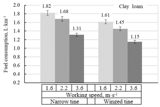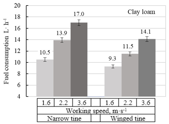 The results of performed experiment showed, that the hourly fuel consumption depends more on working speed, than on tine types, which explains that movement of tractor itself requires higher fuel content and more energy is needed to overcome inertial soil forces. It was found that hourly fuel consumption has direct relation with tillage resistance level and soil type: on clay loam it was 1.5–2.5 L·h−1 higher than on loam soil. When the speed was increased from 1.6 to 3.6 m∙s−1, the hourly fuel consumption in loam soil increased from 7.9 to 14.5 L·h−1, and on clay loam soil—from 9.3 to 17.0 L·h−1 independent of type shape. Hourly fuel consumption was increased from 14.1 to 17.0 L·h−1 when winged shape was changed to narrow tines shape type on clay loam at maximum working speed (3.6 m·s−1) and from 9.3 to 10.5 L·h−1 at minimum speed (1.6 m·s−1). When the shape was settled from winged to narrow, the hourly fuel consumption increased 1.0–1.3 L·h−1 on loam soil, and 1.2–2.9 L·h−1 on clay loam.