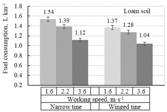 - The hourly fuel consumption for soil renovation varied depending on selected tillage regime mode and soil type. To restore the 1 km length of tramline on loam soil required fuel consumption varied depending on selected tillage regime. The minimum fuel consumption was 1.04 L·km−1 on loam soil and 1.15 L·km−1 on clay loam with winged tine shape at highest working speed.