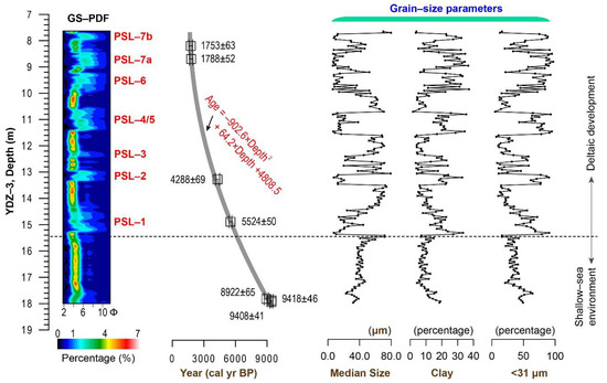 In the study area, the regional sea level rose up to the highest level at ~7000–6000 yr BP [39,40], and due to sea-level rise stagnation [17,41], the Huanghe River delta initiated at ~6000 14C yr BP [10,11,13]. Prior to construction of major river dams, the hydrodynamics involved in deltaic erosion were much less than sediment inputs, resulting in progradation of the delta [42,43,44]. Core YDZ–3 locates downstream to each PSL, and the drilling site was underwater prior to 1855 AD. Because the delta area is generally dominated by cyclonic tidal and geostrophic flows, the YDZ–3 site can record the major changes of the Huanghe River delta in the Holocene. Due to its distal position, the characterized variability of the unmixed grain-size components can be correlated to the eight intervals of changing channel and chenier development in the Holocene (Figure 5).