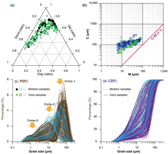 Characteristics of sediment grain size of core YDZ–3 and 35 surface samples. (a) Ternary diagrams; (b) C–M diagrams; (c,d) Grain-size distributions, PDF: probability density function, CDF: cumulative distribution function. Comp–1, –2, and –3 are three components by mathematical unmixing in Figure 4.