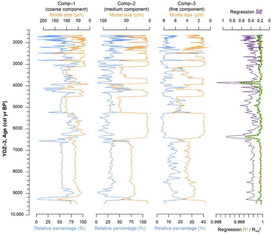 Specifically, changes in modal sizes of each component are similar, while changes in contents are different (Figure 4). Prior to ~6400 yr BP, all parameters changed little, and after that, all changes were amplified, consistent with other grain-size parameters (Figure 2). Eight intervals can be similarly identified according to changes in modal sizes, and between each interval, all transitions are abrupt. A negative correlation between Comp–1 and Comp–2 contents is also evident. Integrating these findings, it is inferred that although modal sizes and contents of the three components are different, all parameters are closely correlated, indicating only one major factor controlling sedimentary dynamics of core YDZ–3 in the Holocene.