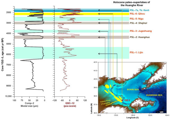 Moreover, based on the PCA result of sediment grain-size, Yi et al. [8] only identified five PSLs of the Huanghe River in sedimentary sequences but missed two PSLs (Figure 5), and they also claimed no consistency between deltaic evolution of the Huanghe River and EASM changes. Checking the difference between two methods, we found that the information of sedimentary dynamics (modal size) and relative contribution (content) are combined in the PCA result. This integration may cause centennial changes to not be evident in the derived record (GSC–12). Hence, we suggest that in a complex sedimentary environment, such as the Huanghe River delta, multiple checks between different grain-size analyses are necessary.