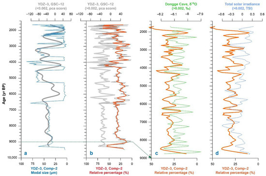 Correlating YDZ–3 record to various paleoenvironmental proxies on centennial timescales. (a) YDZ–3 Comp–2 modal size with the low-frequency (<0.002) component of GSC–12 record [8]; (b) YDZ–3 Comp–2 relative percentage (original value, dashed line; 3–point moving average, solid line) with the high-frequency (>0.002) component of GSC–12 record [8]; (c) Comparison between YDZ–3 Comp–2 relative percentage and the high-frequency (>0.002) component of Dongge Cave δ18O record [50]; (d) Comparison between YDZ–3 Comp–2 relative percentage and the high-frequency (>0.002) component of total solar irradiance (TSI) during the Holocene [51]. Noted that data in (c,d) are 3–point moving average records.
