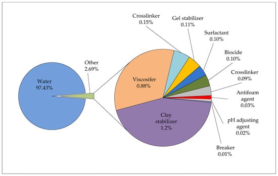 According to the base fluid, the following fracturing fluids are distinguished: water-based fluids, fluids based on produced water, oil-based fluids, acid-based fluids, alcohol-based fluids, foam-based fluids, emulsion-based fluids and energized (cryogenic) fluids (CO2, N2, etc.) [,,,,,]. Each of these fluids has its advantages and disadvantages and a specific area of application.