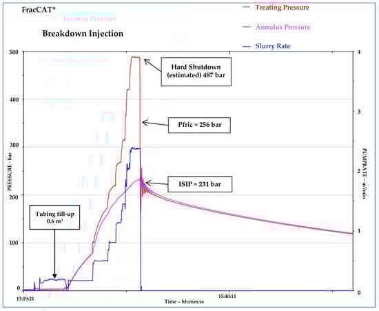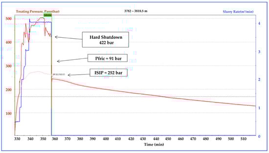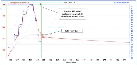 According to Almubarak et al. (2020), hydraulic fracturing treatments consume at least 757 m3 of water in conventional wells and up to 60,567 m3 of water in unconventional wells []. However, 39 m3 of fluid and approximately 7000 kg of proppant were used to perform one HF in Croatia, which is far less than the stated amount [].