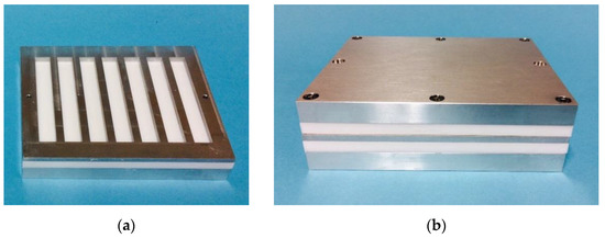 The molds to form the specimens, (a) Bottom plate, PTFE (polytetrafluoroethylene) plate, polyester film, and molds plate, (b) closed form adding another PTFE plate and the top plate.