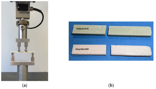 The bending strength was determined using a four-point bending test as described in ISO 5833:2002-05 and in ISO 16402:2008-05 [17,19]. The sample dimensions were measured before testing. Each measurement was performed three times with an accuracy of ± 0.1 mm, and an average value was calculated for the respective sample geometry. The four-point bending tests were carried out with a material testing machine (Zwick/Roell Z005, Ulm, Germany) and a cross-head speed of 5 mm/min (Figure 2). The force on the central loading points was increased, starting from zero until the specimen broke. The deflection of the specimen was recorded as a function of the applied force. For each tested specimen, the bending strength was calculated using the following equation: . Where F is the force at break (in N), b is the average measured width of the specimen (in mm), h is the average thickness of specimen (in mm), and a is the distance between the inner and outer loading points. According to the ISO 5833:2002-05, the distance between the outer and inner loading points was 20 mm [17].
