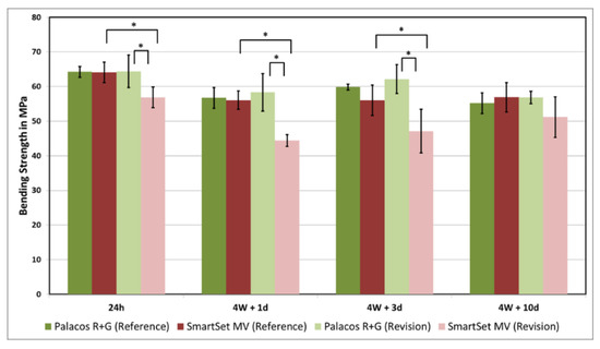 However, the revision samples of SmartSet MV showed a significantly lower bending strength compared to Palacos R+G except at the testing time of 4 weeks plus 10 days (24 h p = 0.008; 4W + 1d p < 0.001; 4W + 3d p < 0.001; and 4W + 10d p = 0.221).
