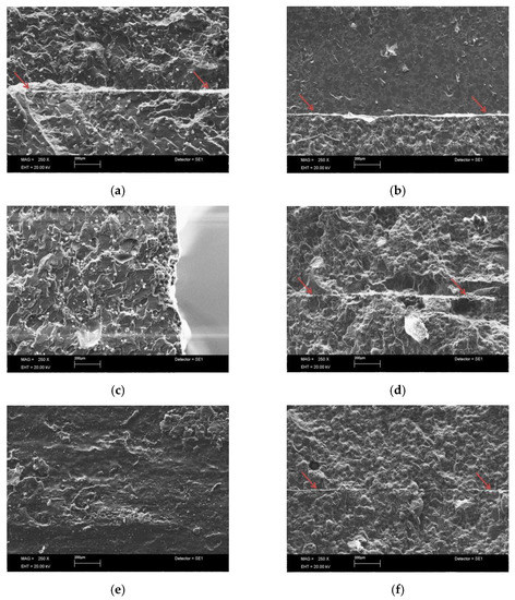 Images of the fractured surface with the scanning electron microscope (SEM); Palacos R+G revision at 4W + 1d (a), 4W + 3d (c), and 4W + 10d (e); (b) SmartSet MV revision at 4W + 1d (b), 4W + 3d (d), and 4W + 10d (f), red arrows show the line between the two layers.