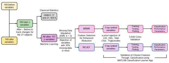 To consider the variance in the population at the start of the study, the statistical differences between the two groups were evaluated for delta (∆) variables calculated by subtracting each variable’s initial values from their values at three months. The percentage of missing data was calculated and variables with more than 30% missing data were rejected from the analysis since data imputation for larger amounts of missingness may become very imprecise [52]. Using MATLAB version 2019b (The MathWorks, Inc., Natick, MA, USA), missing data for the remaining variables were imputed by the k-nearest neighbors technique using k = 3 [53]. Each ∆ variable was normalized with respect to its absolute maximum value. The high number of ∆ variables for a small number of subjects presented a challenge in detecting, with sufficient power, the variables that might be participating in a perfusion-related mechanism for mood improvement due to statin use. To handle this, machine learning techniques were applied as described in the following sections and depicted in Figure 2.