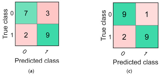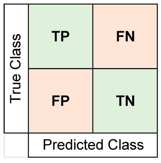 For all training sessions, we used k-fold cross-validation with k = 5. We trained these 25 classifiers for 20 iterations to report a more reliable accuracy value, since each cross-validation may have very different training and testing sets created for classification [66]. The training of 25 classifiers through 20 iterations was done twice separately for the five features selected by each algorithm. The best classification performances as an average for the 20 iterations are reported in the Results section. We also obtained confusion matrices (using the number of true positives (TP), false positives (FP), true negatives (TN), and false negatives (FN)) and area under curve (AUC) values for the receiver operating characteristic (ROC) curve. The format of the confusion matrix can be seen in Figure 3. To add a more detailed understanding of the classifier’s performance, values for sensitivity, specificity, precision, false omission rates (FOR), and the Matthews correlation coefficient (MCC) were also calculated. We report the confusion matrix and the ROC curves for the iteration with the closest accuracy value to the average value in the Results section. The formulas used for calculating these performance indices are shown in Table 2.