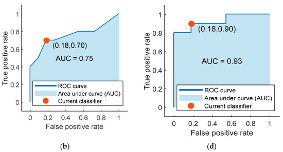 Finally, the highest accuracy obtained by training the 25 different classifiers over 20 iterations with the features selected by the ReliefF algorithm was 86.67%. The classifier that reported this accuracy was the weighted KNN classifier. The iteration for the weighted KNN classifier closest to the average value had an accuracy of 85.71%, and its confusion matrix with the ROC curve (AUC value = 0.93) are shown in Figure 4c,d, respectively. Values for other parameters evaluating classification performance including sensitivity, specificity, precision, FOR, and MCC for this particular iteration are also reported in Table 5.