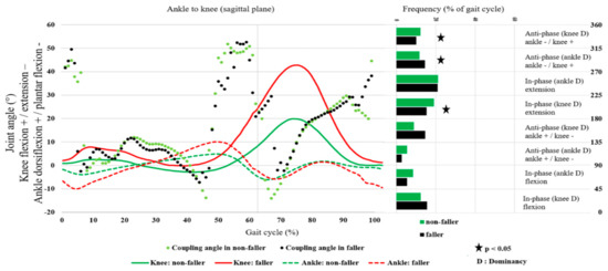 The intra-joint coordination pattern of the lower extremity and its variability in the sagittal plane were significantly different between fallers and non-fallers in some instants of the gait cycle. This confirms, to some extent, our second and third hypotheses about significant differences in the intra-joint coordination pattern and its variability in the lower extremity between fallers and non-fallers. Fallers showed a more anti-phase coordination pattern in knee flexion-ankle plantar flexion with ankle dominancy (270–315°) compared to non-fallers; this is related to the greater knee flexion in all gait cycles and greater plantar flexion in loading response and late swing in fallers (Figure 1). The greater knee flexion in all gait cycles was probably a result of knee extensor weakness in older people with a history of falling. Knee extensors eccentrically control knee flexion during the stance phase of gait [38], and individuals with knee extensor weakness cannot efficiently extend their knee in the stance phase. Moreover, studies on differences between young and older adults showed that the contribution of the hips and ankles increased and decreased, respectively, with aging [39,40]. Fallers seem to have more ankle plantar flexion during late swing and initial contact to compensate more knee flexion and be more cautious about foot contact with ground.