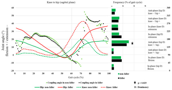 Finally, a number of study limitations need to be considered. First, we examined the intra-joint coordination pattern and its variability only in the sagittal plane; however, the intra-joint and intra-segment coordination pattern in other planes of motion also need to be considered. Second, the examination of coordination patterns and their variability together with electromyography and analysis of kinetic parameters such as joint torques and power flows may provide additional insights into the biomechanical differences of gait patterns between fallers and non-fallers. Third, we used a motion analysis system with reflexive markers in the laboratory setting for kinematic analysis that may affect the participants’ natural gait pattern; however, long-term kinematic analysis with IMU-based systems out of a laboratory may give a more accurate results about gait pattern in fallers and non-fallers [42]. Finally, in this study, the non-fallers were defined as participants who had not fallen within the last 12 months; thus, the time domain for differentiating between fallers and non-fallers may be small.