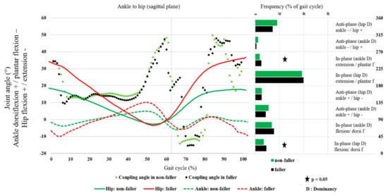 The frequency of IPPD for the hip flexion and ankle dorsiflexion coordination pattern (p = 0.003) and that of IPDD for the hip extension and ankle plantarflexion coordination pattern (p = 0.006) were significantly greater in fallers than in non-fallers (Figure 3).