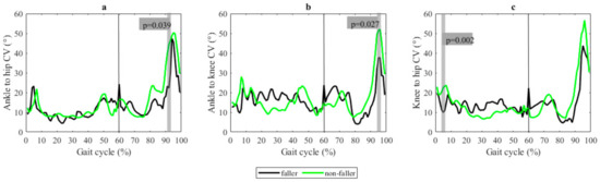 (a) Ankle-to-hip coordination variability (CoordV), (b) ankle-to-knee CoordV, and (c) knee-to-hip CoordV during gait cycles in fallers and non-fallers.