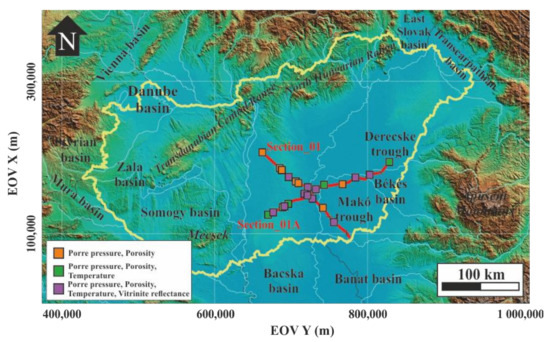 Topographic map of the Pannonian (modified after [13]) basin with the main subbasins; the yellow outline represents the political border of Hungary, and the red lines show the direction of the Section_01 (from NW to SE) and Section_01A (from NE to SW). The map uses EOV (Uniform National Projection system), which is a plane projection system used uniformly for the Hungarian civilian base maps and spatial informatics. Coloured squares represent the wells that were used to calibrate the basin models. Orange squares represent wells with measured porosity and pore pressure data, the green squares represent wells with porosity, pore pressure, and temperature data and purple wells represent porosity, pore pressure, temperature, and vitrinite reflectance data. Wells without colour squares were not applied to calibration due to the lack of measured data.