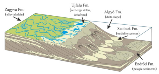 Turbidite series of the Szolnok Formation, which overlays the deep water calcareous and clay marl series, build up from the alteration of fine-grained sandstones and pelites. The lateral extent of sandstone bodies is generally limited; thus, the correlation of sandstone bodies on the long distance are problematic. Delta slope siltstones and clay marls formed the Algyő Formation that contains only a minor amount of sandstone lenses originated from mass flows. The overlaying, mainly sandstone series represents the Újfalu Formation that is covered by the alluvial plain sediments (Zagyva Formation). Two unconformities have been identified within the Late Miocene Pliocene sediment series. The oldest one, approximately 6.8 Ma, was interpreted as a result of a lake-level fall [33,42] or a large canyon incision [43] or a result of different progradation directions [43]. The unconformity near the Late Miocene Pliocene boundary was interpreted as a result of basin inversion [32,44,45] or a sedimental response to the Messinian Salinity Crisis [46]. The uplift was mainly affected the subbasins margins and kept the basin centres subsiding [47]. The compressional stress field significantly affected the sediment fill, which has been tilted from the margins to the basin centres. This study focuses on the Miocene and younger part of the stratigraphic column; Figure 3 shows a simplified stratigraphic chart with the main lithostratigraphic units.