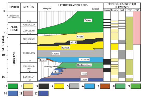 Stratigraphic and petroleum system elements chart of the Great Hungarian Plain (modified after [48,49]): 1 = Alluvial plain; 2 = Lacustrine, self-edge deltas, delta front; 3 = Lacustrine, delta slope; 4 = Lacustrine, deep basin turbidite system; 5 = Lacustrine, deep basin (clay marl); 6 = Lacustrine, shallow to deep basin (calcareous marl); 7 = Lacustrine, rocky shore, shoreface; 8 = Brackish, shoreline, and near shore; 9 = Brackish, shoreline, and abrasional shore; 10 = Marine, shallow marine reef; 11 = Marine, open basin; 12 = Abrasional basal breccia, conglomerate and sandstone.