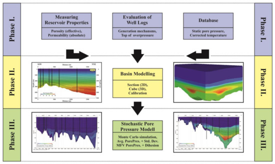 Developed workflow with the three main phases that can deliver the stochastic pressure models to predict and evaluate the subsurface pressure regime on a basin scale.