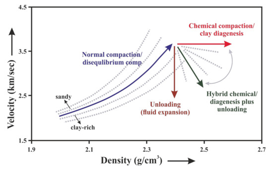 Bulk density and the compressional wave velocity routes in case of different overpressure generation mechanisms. Normal compaction and under-compaction result in the increase of compressional wave velocity and bulk density; thus, deviation from this route suggests the contribution of another mechanism(s).