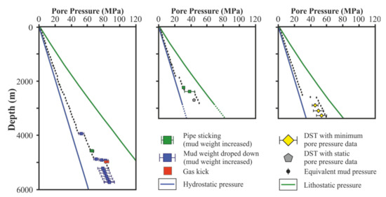 Pore pressure data have been collected into a database in order to make the calibration process easier. The static pore pressure data that were measured during the drill stem tests (DST) are the most reliable data for pressure calibration [57]. Ten DST-derived static pressure values were available from the evaluated wells, which only deliver information about the pressure conditions of two layers (Middle Miocene and the Late Miocene turbiditic reservoirs). More pressure proxy should have been involved to handle the lack of static pressure data and reach a proper pressure calibration.